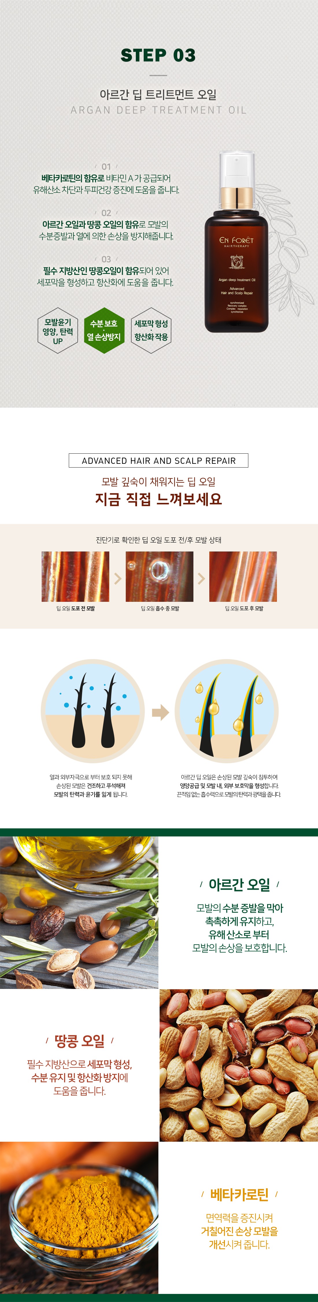 아르간 오일과 베타카로틴이 함유된 아르간 딥 트리트먼트 오일은 끈적임이 없으며 모발에 흡수되어 뛰어난 보습효과를 주고 부드러움과 윤기 그리고 탄력성을 줍니다. 자연 항산화제인 비타민E와 불포화지방산 오메가6가 풍부한 아르간오일은 유해산소로부터 모발을 지켜줍니다.베타카로틴도 거칠어지고 손상된 모발을 개선해 줄 것입니다.