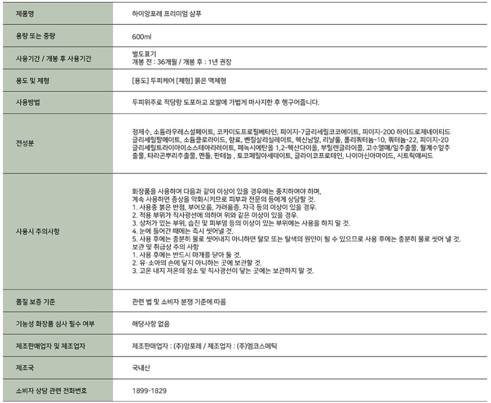 하이앙포레 프리미엄 샴푸 (600ml)