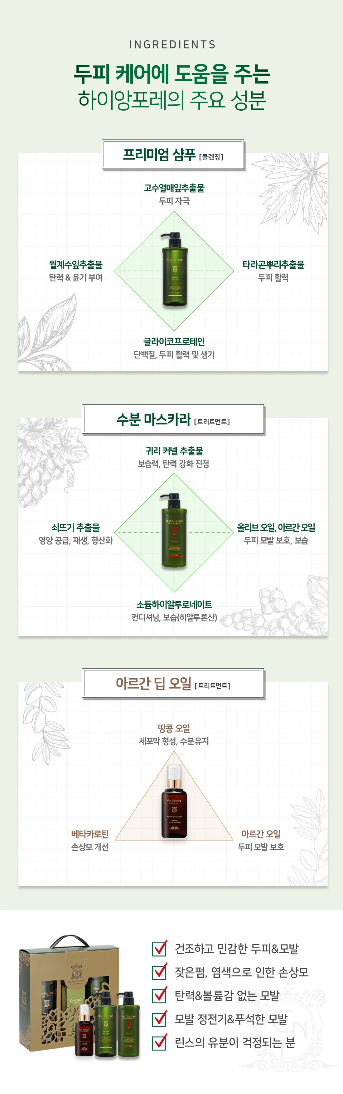 손상된 모발 또는 영양이 부족한 모발에 수분과 영양을 공급하고 윤기와 탄력을 줍니다.